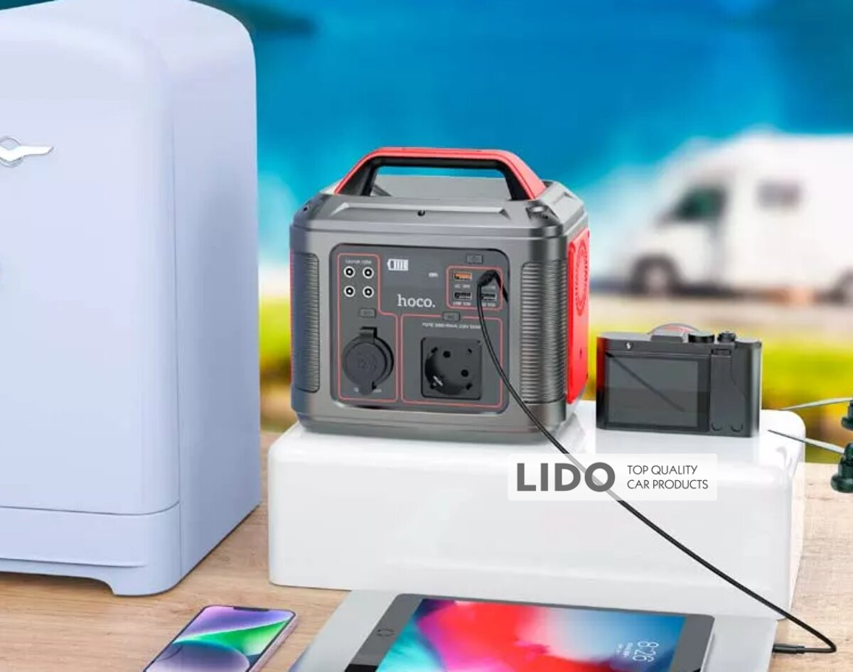 Hoco DB28 — це портативна електростанція невеликого розміру, але з великою ємністю — 80 000 mAh, 296 Wh. Підтримує заряджання від мережі, через автомобільні зарядні пристрої та сонячні панелі.