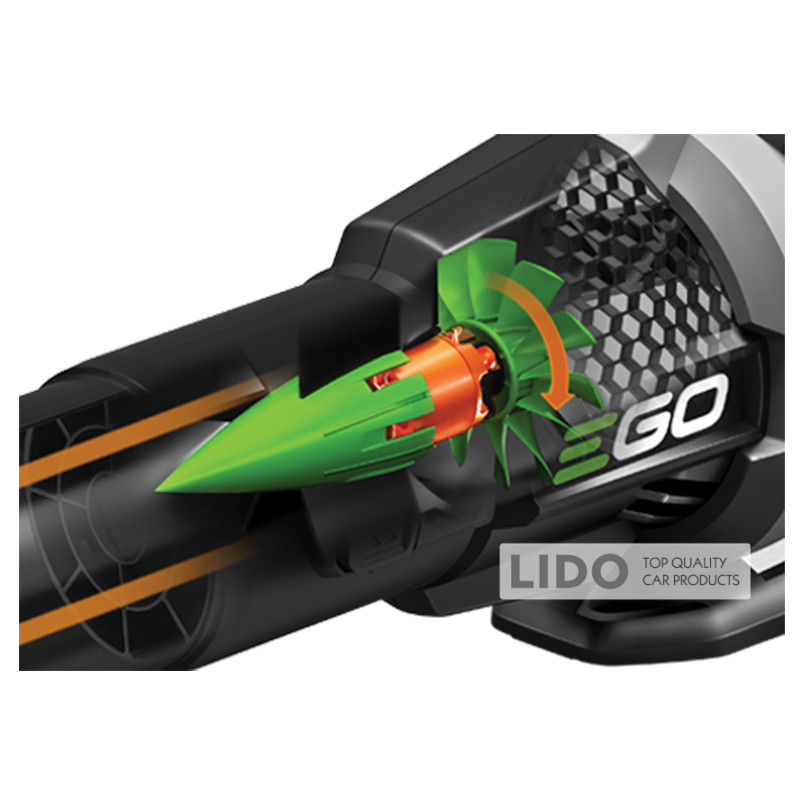 EGO LB5300E — потужний та надійний інструмент, який дозволяє швидко та зручно прибрати листя на великих майданчиках. Високу потужність та продуктивність забезпечує безщітковий двигун, який живиться від Li-ion акумуляторів EGO 56V. Завдяки особливій формі турбіни, повітродув здатний видати до 900 куб.м/год повітря на швидкості до 176 км/год. Швидкість потоку можна плавно регулювати, для максимальної продуктивності на корпусі є окрема кнопка BOOST. Час роботи повітродуву залежить від підключеного акумулятора та вибраного режиму роботи.
