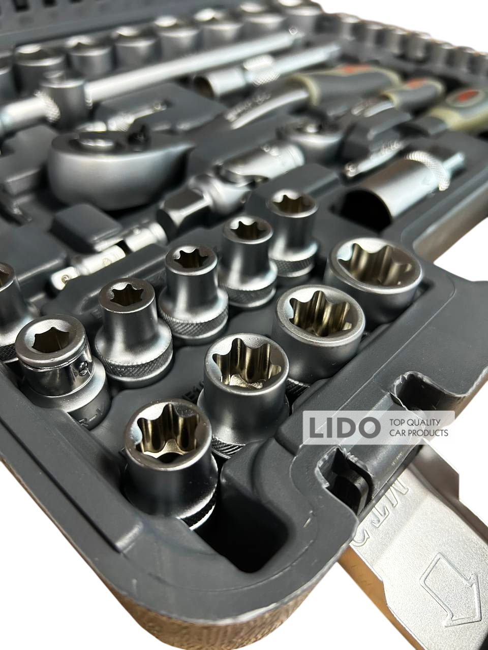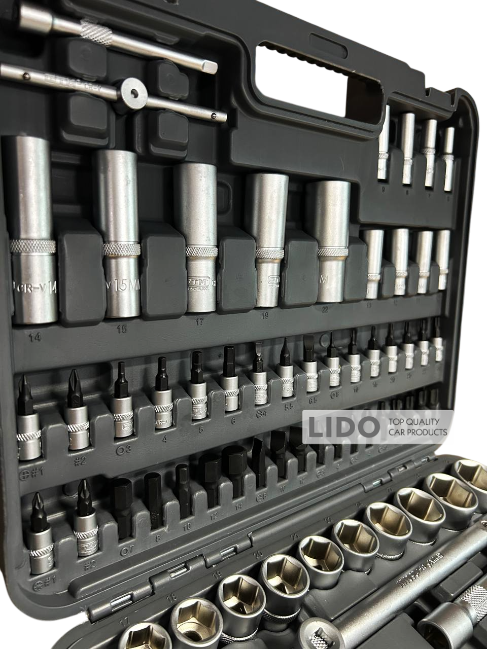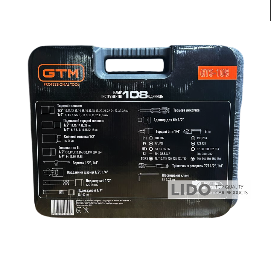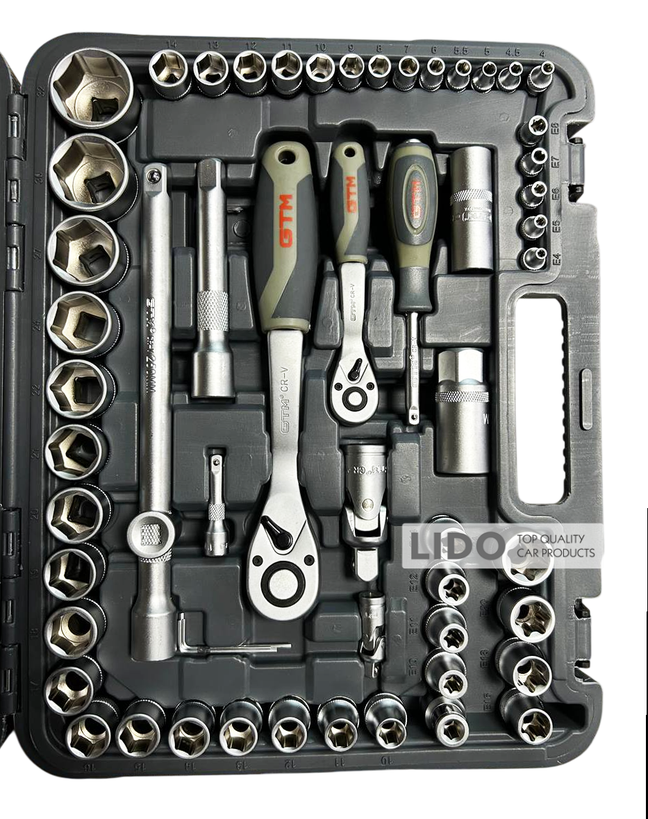 GTM GTS-108 - універсальний набір інструментів, призначений для використання вдома, в майстернях і СТО. Всі інструменти виготовлені з високоякісного сплаву хромо-ванадієвої сталі. Завдяки цьому набір не боїться корозії і впливу вологи. Включає в себеторцеві головки 1/4" та 1/2", тріскачки, воротки і перехідники. Поставляється у фірмовому ударостійкому захисному кейсі GTM.