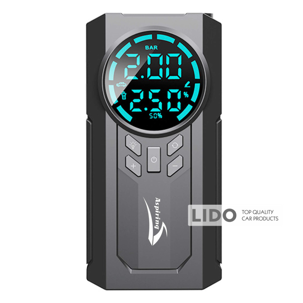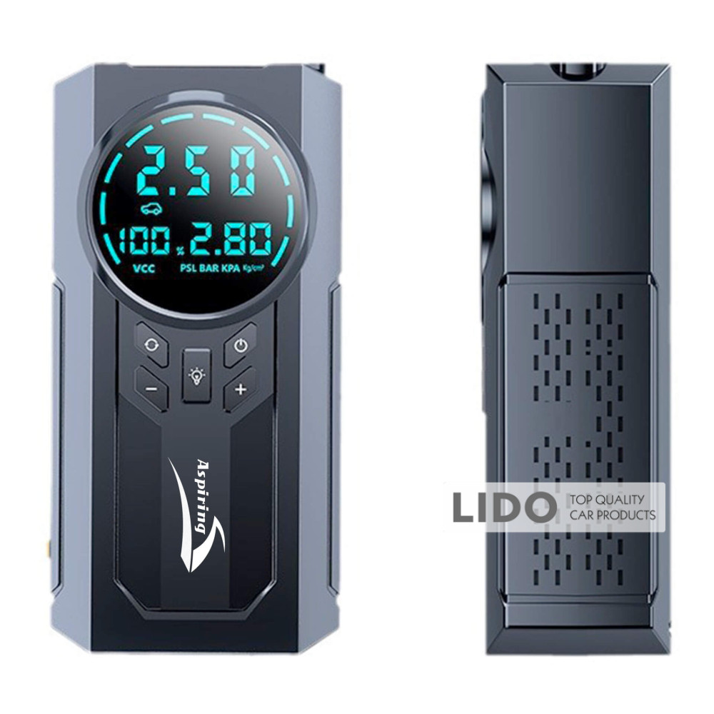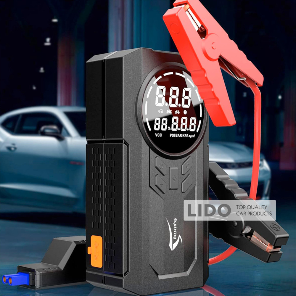 - Особливості: Пристрій 4-в-1: пусковий пристрій, павербанк, ліхтарик та насос для шин