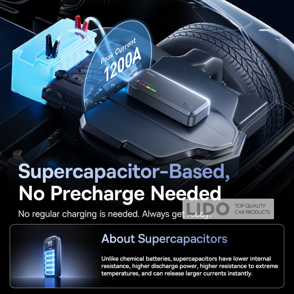 Автомобільний пусковий пристрій Baseus PrimeTrip VJ1 Supercapacitor Car Jump Starter 1200A Cosmic Black — це стильне, довговічне та високопродуктивне рішення для водіїв, яким потрібне надійне живлення в будь-яких умовах. На відміну від традиційних пускових пристроїв на літієвих батареях, ця модель використовує суперконденсатор ємністю 400F, що забезпечує тривалу надійність та миттєву подачу живлення без ризику старіння акумулятора. Забезпечуючи піковий струм до 1200 А та пусковий струм 600 А, він достатньо потужний для запуску автомобілів з бензиновими двигунами об'ємом до 4,0 л або дизельними двигунами об'ємом 2,5 л.