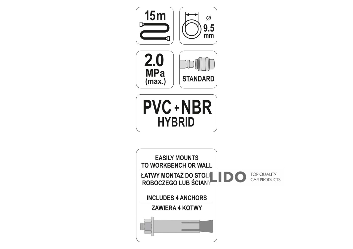 - Діаметр подачі повітря (шланг) – 3/8″ (≈ 9,5 мм)