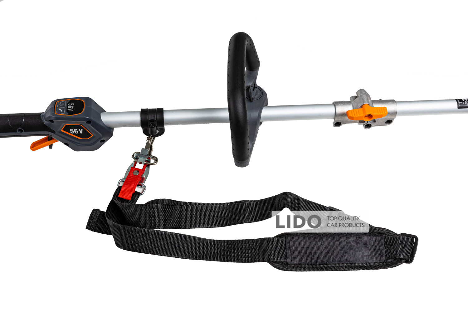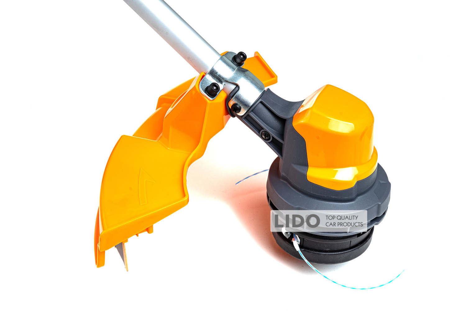 - Комплектація: Акумулятор 1 шт, Зарядний пристрій, захисний кожух, ключ, косильна головка, Ремінь