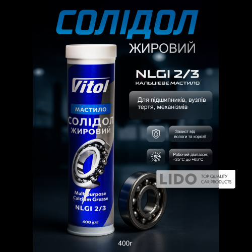 VITOL Кальцієве мастило — універсальне засіб для зменшення тертя та зносу в рухомих механізмах. Ідеально підходить для змащування підшипників, шарнірів, направляючих та інших деталей, що працюють в умовах помірних навантажень і температур. Відзначається гарною водостійкістю та адгезією до металевих поверхонь.