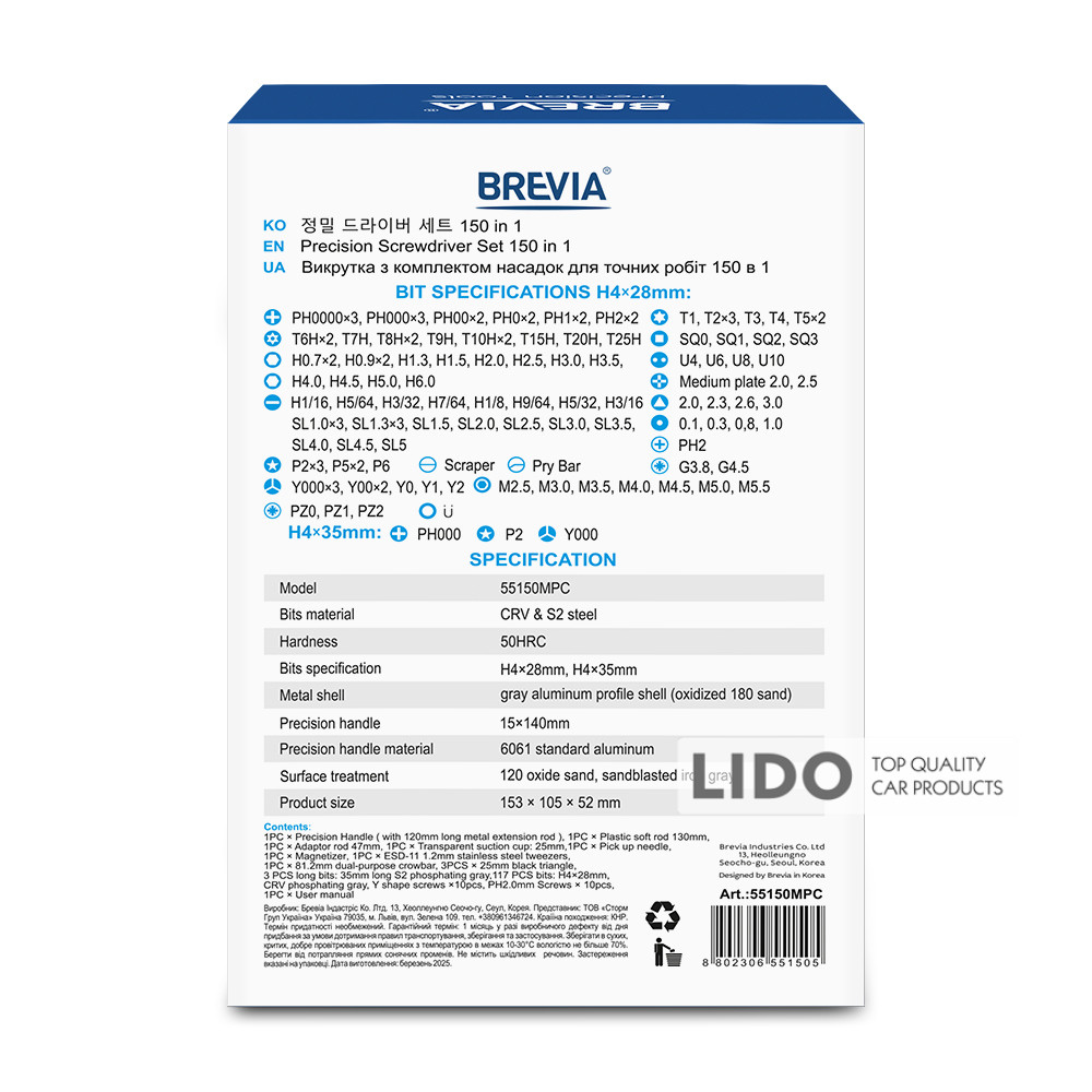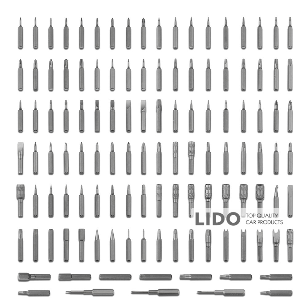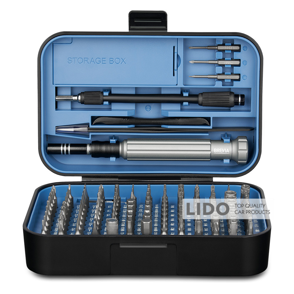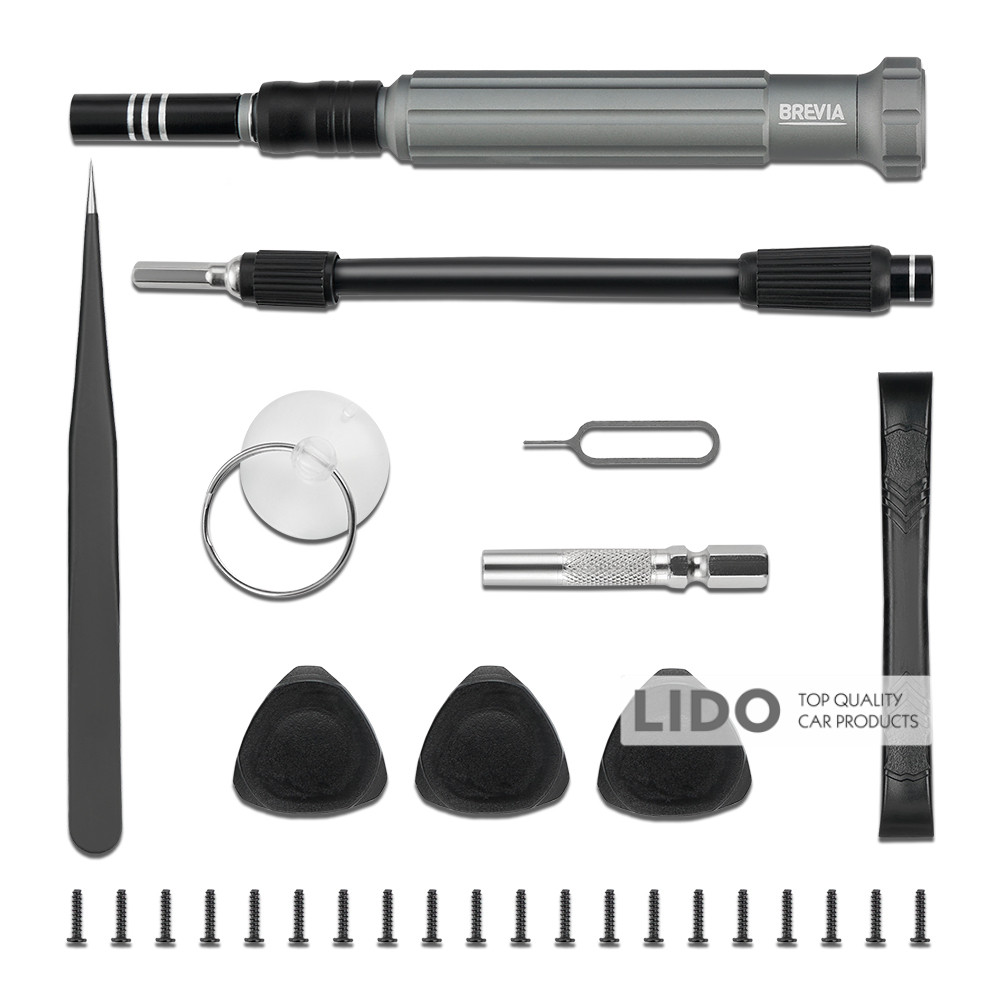 Отвертка: алюминиевая 15х140мм со встроенным удлинителем 120мм - 1шт Удлиненные насадки: S2 steel, 60HRC, H4x35мм - 3шт Насадки: CRV steel, 50HRC, H4x28мм – 117шт Переходник для шуруповерта 47мм - 1шт Шпатель пластиковый, двусторонний 81,2мм - 1шт Пинцет металлический 140мм - 1шт Удлинитель металлический, гибкий 130мм - 1шт Встроенный намагничитель/размагничитель - 1шт Присоска 25мм - 1шт Инструмент для снятия SIM-карты – 1шт Винт в форме Y – 10шт Винт PH2.0мм – 10шт Съемник (медиатор) пластиковый - 3шт Пластиковый кейс Руководство пользователя Размер кейса: 153х105х52мм