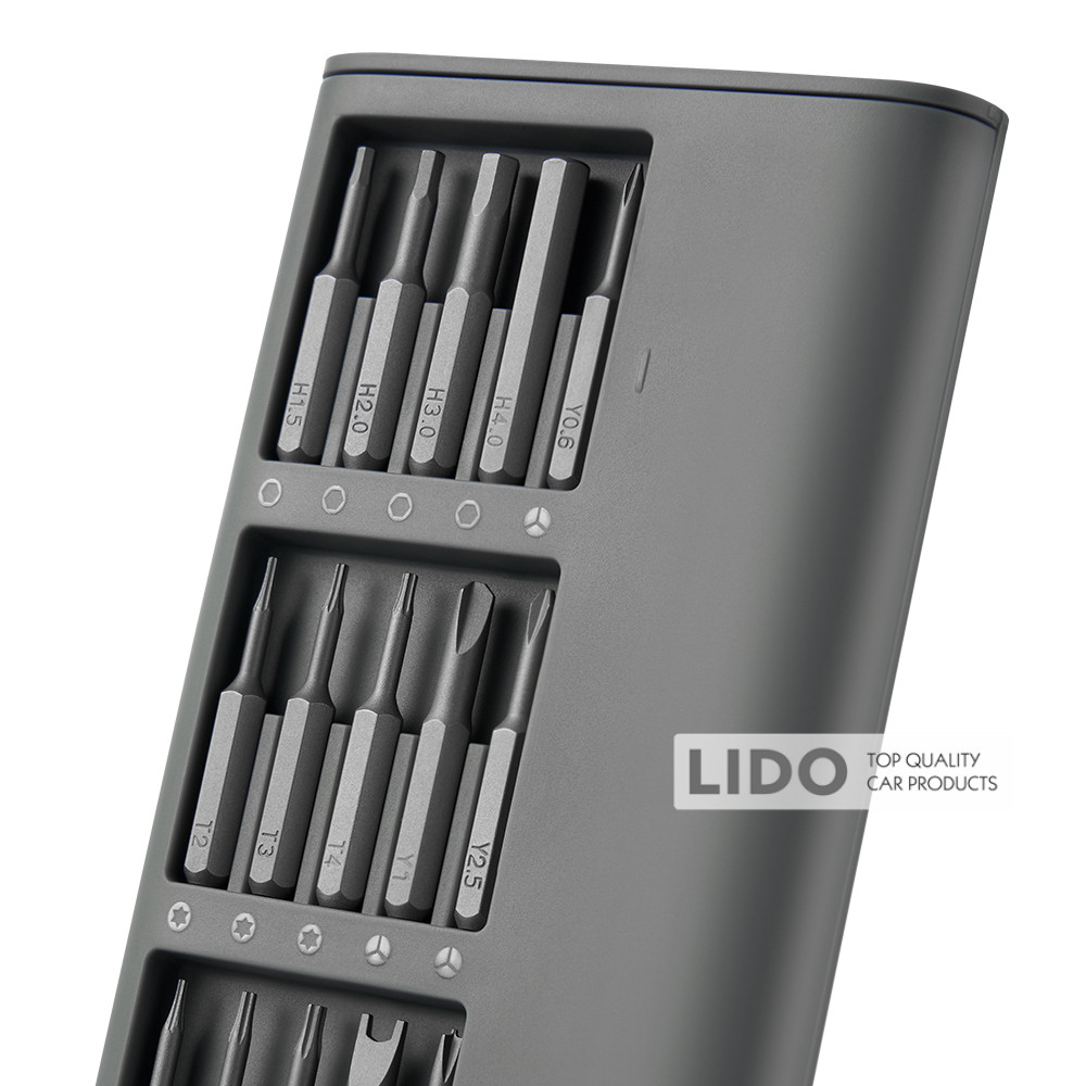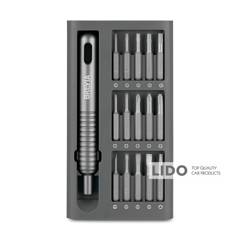 Отвертка: алюминиевая 15х140мм со встроенным удлинителем 120мм - 1шт Удлиненные насадки: S2 steel, 60HRC, H4x35мм - 3шт Насадки: CRV steel, 50HRC, H4x28мм – 117шт Переходник для шуруповерта 47мм - 1шт Шпатель пластиковый, двусторонний 81,2мм - 1шт Пинцет металлический 140мм - 1шт Удлинитель металлический, гибкий 130мм - 1шт Встроенный намагничитель/размагничитель - 1шт Присоска 25мм - 1шт Инструмент для снятия SIM-карты – 1шт Винт в форме Y – 10шт Винт PH2.0мм – 10шт Съемник (медиатор) пластиковый - 3шт Пластиковый кейс Руководство пользователя Размер кейса: 153х105х52мм