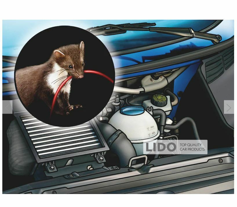 Держит куниц и грызунов как можно дальше от кабелей, проводов, пластиковых или резиновых частей и электрических систем в домах и транспортных средствах